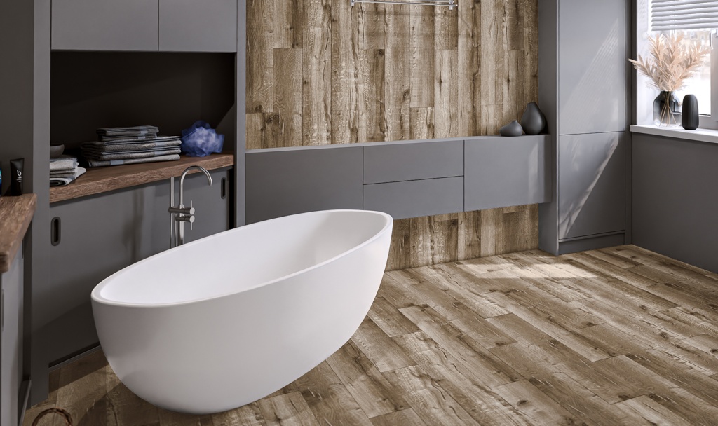 Кварцвиниловый ламинат для ванной — это не компромисс, а полноценная альтернатива плитке. Влагостойкий виниловый ламинат справляется с брызгами, перепадами влажности и даже горячим паром. А ещё он тёплый на ощупь и совместим с системой «тёплый пол». Его можно уложить как на пол, так и на стены.