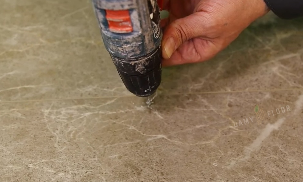 Осторожно просверлите маленькое отверстие в плитке. Важно контролировать глубину и не задеть стяжку.