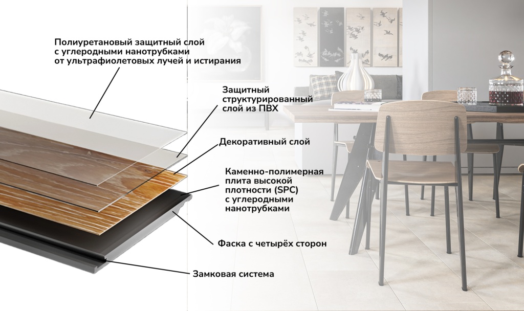 SPC ламинат имеет ряд преимуществ, которые делают его идеальным решением для ресторанов и кафе: