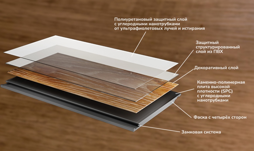 Для начала важно понять, что такое SPC. SPC (Stone Polymer Composite) - каменно-полимерный композит, твердая плита, являющаяся основой кварцевого напольного покрытия. В составе SPC плиты - каменная крошка - карбонат кальция (75%) и первичный ПВХ (25%). Такое напольное покрытие полностью влагостойкое и отличается повышенной износостойкостью. Кварцвиниловый ламинат можно укладывать даже в “мокрых” зонах - на кухне и в ванной. Замковый SPC ламинат совместим с любыми системами теплого пола