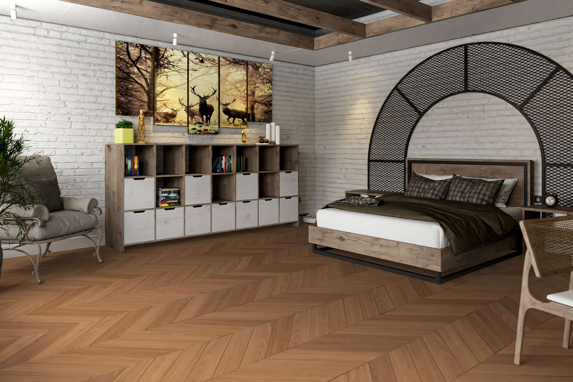 Сочетание классического шевронного пола с современными предметами мебели —