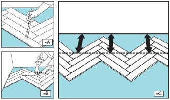 Второй ряд начните укладывать с панели А. Расположите новую панель напротив предыдущей, как показано на рисунке, и прижмите к полу, чтобы закрепить.
