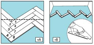 Следующая панель - А. Подсоедините ее длинной стороной к углу короткой стороны предыдущей панели В и прижмите к полу для закрепления. Продолжайте соединять панели таким образом, сколько поместится вдоль стены, с которой вы начали укладку.