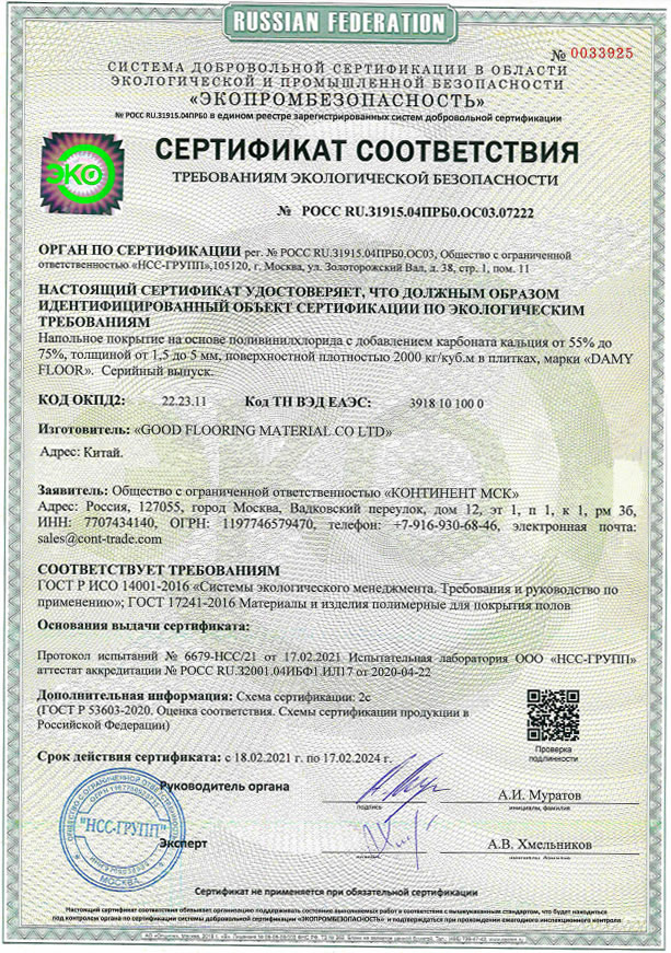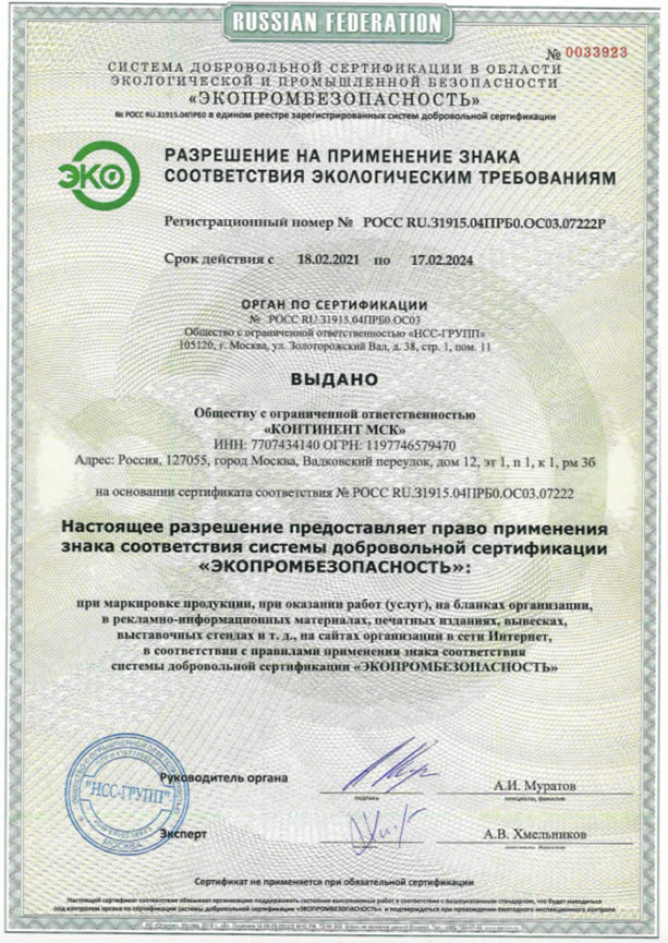 Экологический сертификат (или сертификат экологического соответствия) – документ, подтверждающий высокий уровень качественных экологических характеристик продукции. Система экологической сертификации предусматривает как обязательную, так и добровольную экологическую сертификацию. Сертификат выдается на основании испытаний, проведённых в аккредитованных испытательных лабораториях РФ.