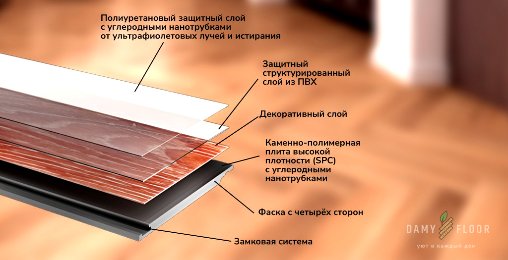 В ассортименте DAMY FLOOR представлены усовершенствованные SPC покрытия, рассчитанные на длительную эксплуатацию и интенсивные нагрузки.